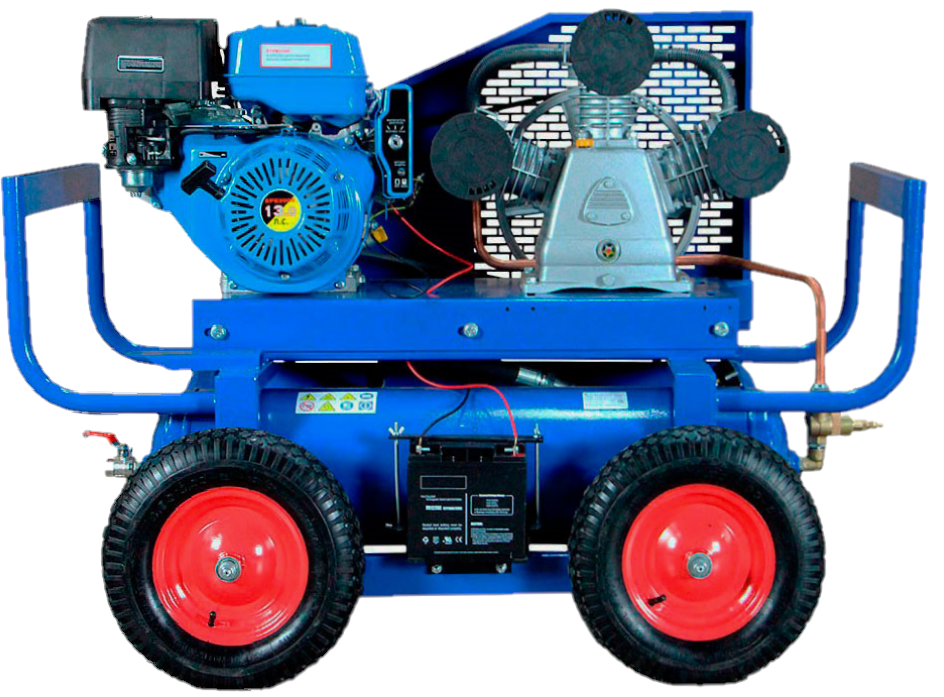 Концептуально бытовой компрессор представляет собой передвижной агрегат из двигателя и компрессорного блока, установленных на накопительной емкости.